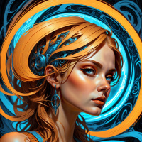 На картинке изображена молодая женщина с блондинистыми волосами на фоне, напоминающем космическое пространство. Волосы у нее уложены в пучок, а в ушах — изящные серьги. Она одета в топ в стиле корсета, выполненный из, кажется, мерцающего материала, возможно, металла или пластика, украшенного сложными деталями. Фон выполнен в сине-золотых тонах с круговыми узорами, создающими впечатление небесного мотива.