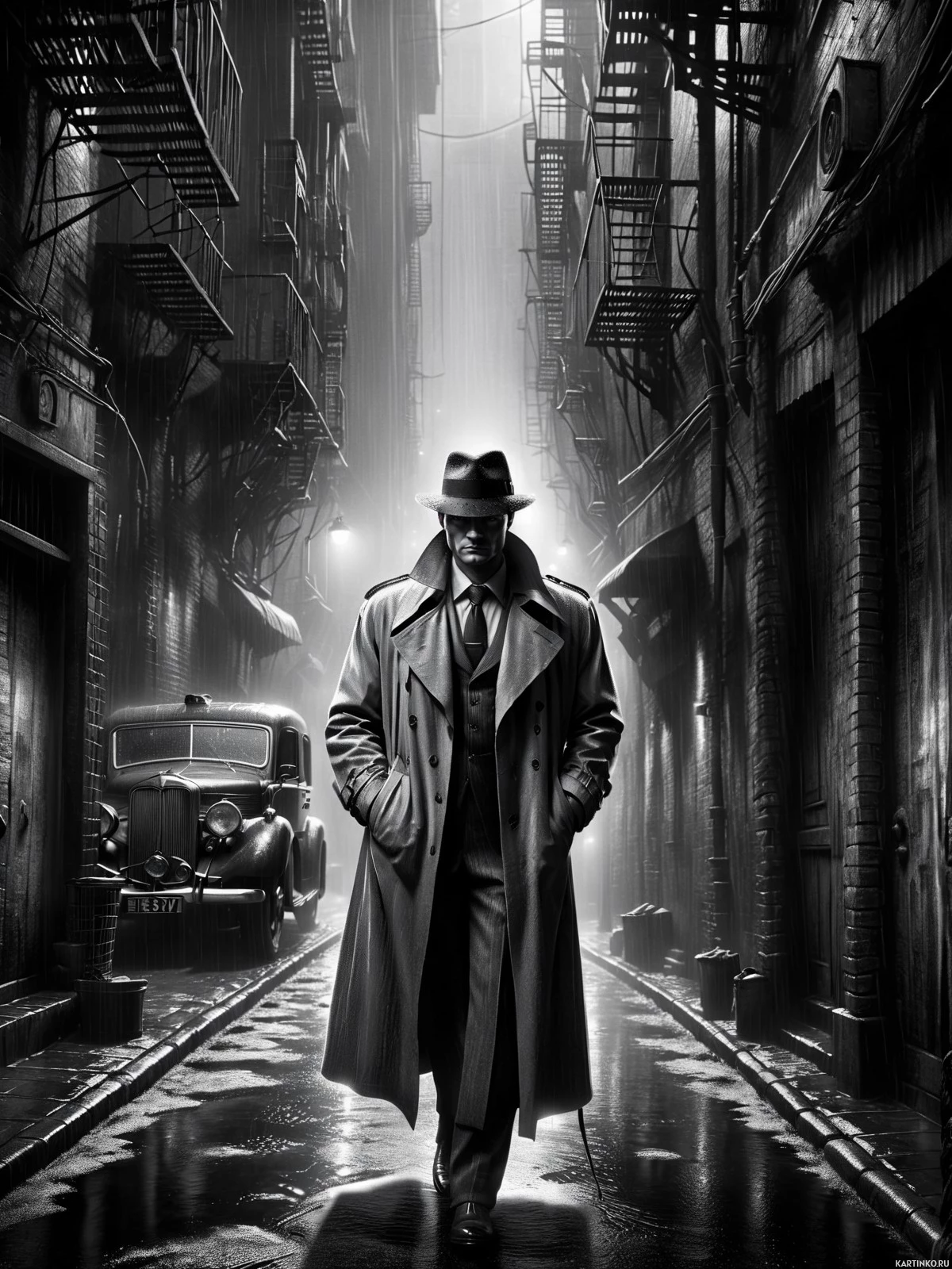 На картинке мужчина в шляпе и пальто стоит на ночной городской улице. От дождя мокрый асфальт отражает свет нескольких уличных фонарей, рассыпанных по всей сцене. Архитектура зданий указывает на городской пейзаж, возможно, в стиле начала XX века.