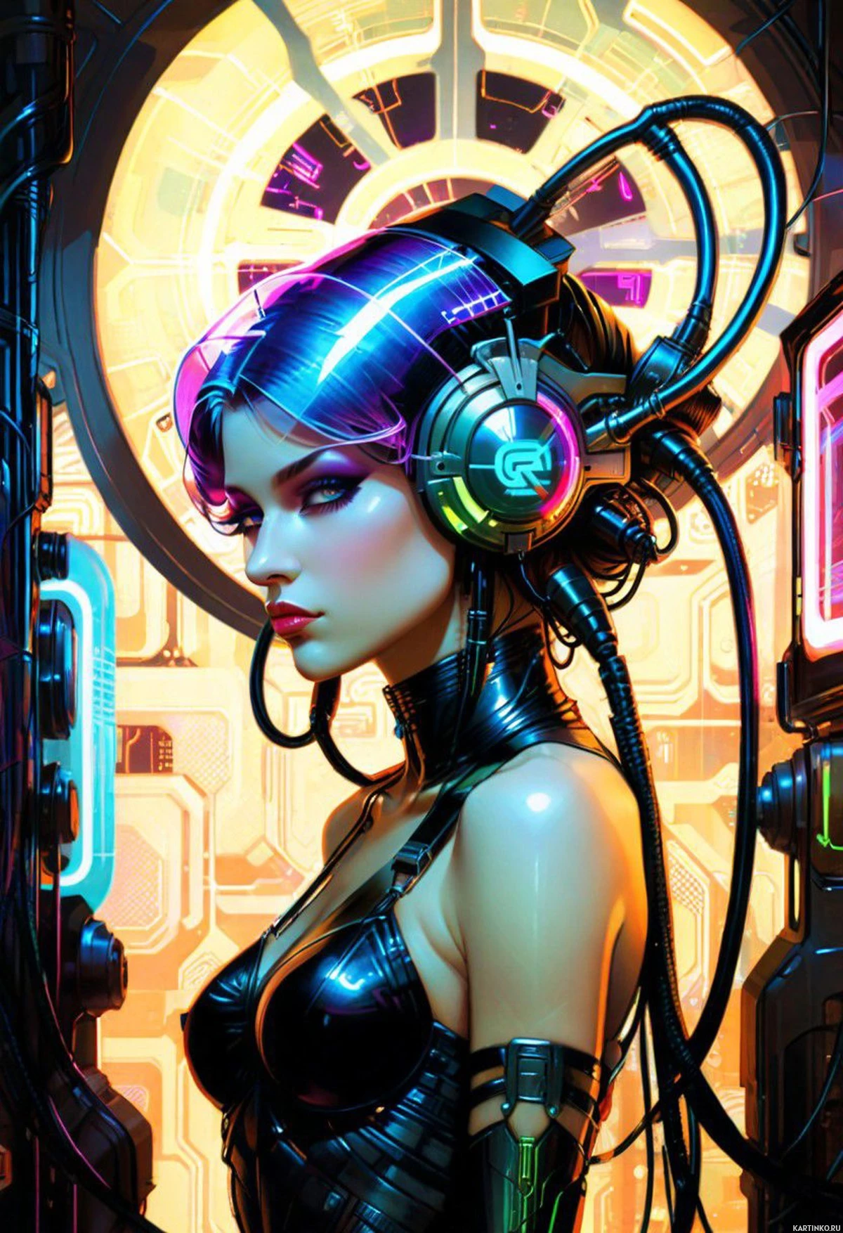 Это цифровая картинка, на которой изображена девушка с фиолетовыми волосами в черном кожаном наряде, выполненном в стиле киберпанк или научной фантастики. На её лице и голове видны электронные провода и разъемы, что говорит о каком-то продвинутом технологическом интерфейсе. Фон подсвечен оранжевым светом, исходящим, кажется, от центральной панели с кнопками и экранами, создавая ощущение высокотехнологичного командного центра. На заднем плане также присутствуют другие цифровые элементы, подчеркивающие футуристическую атмосферу картинки.