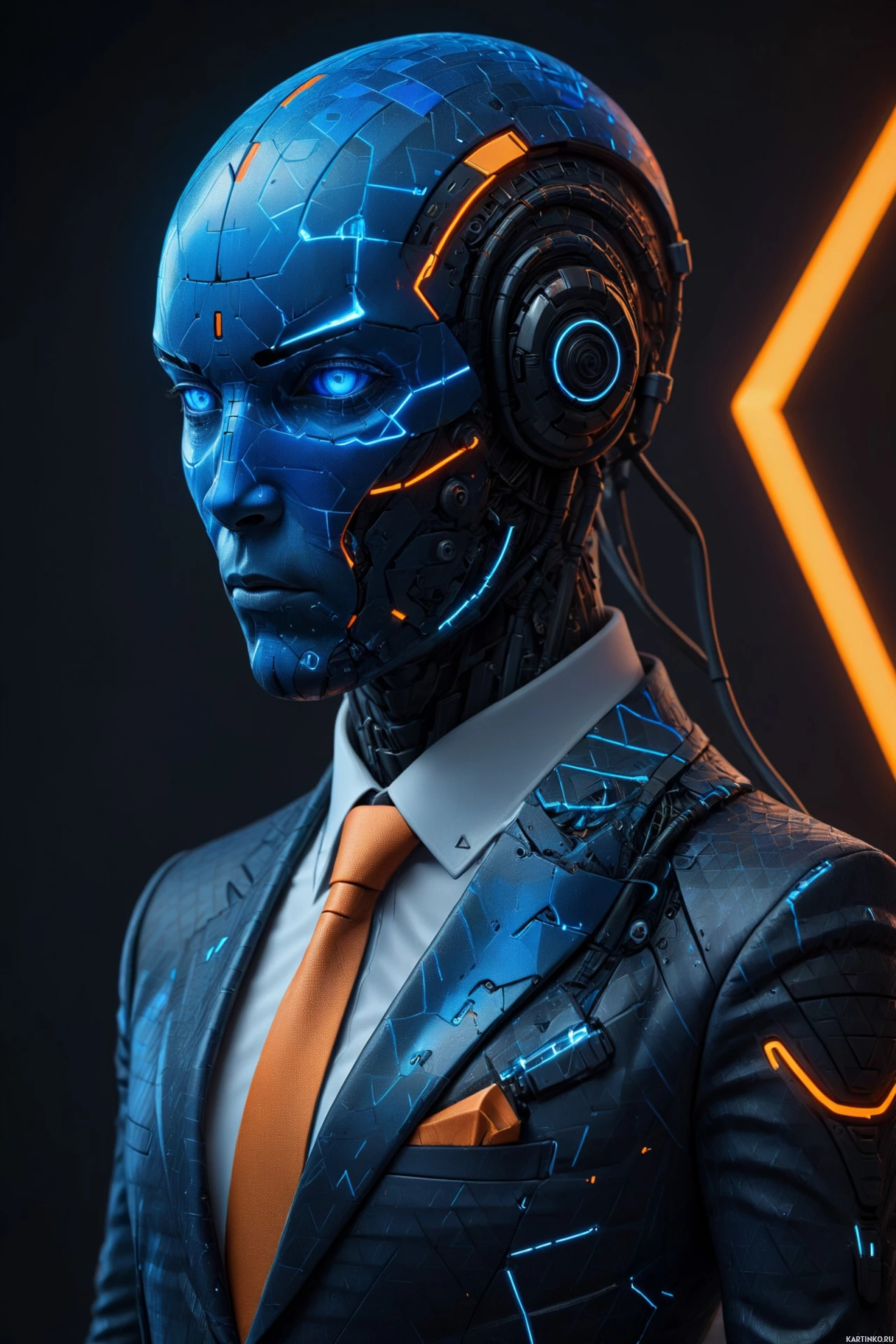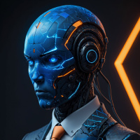mechanical components in shades of blue and orange with exposed circuitry and wiring. It wears