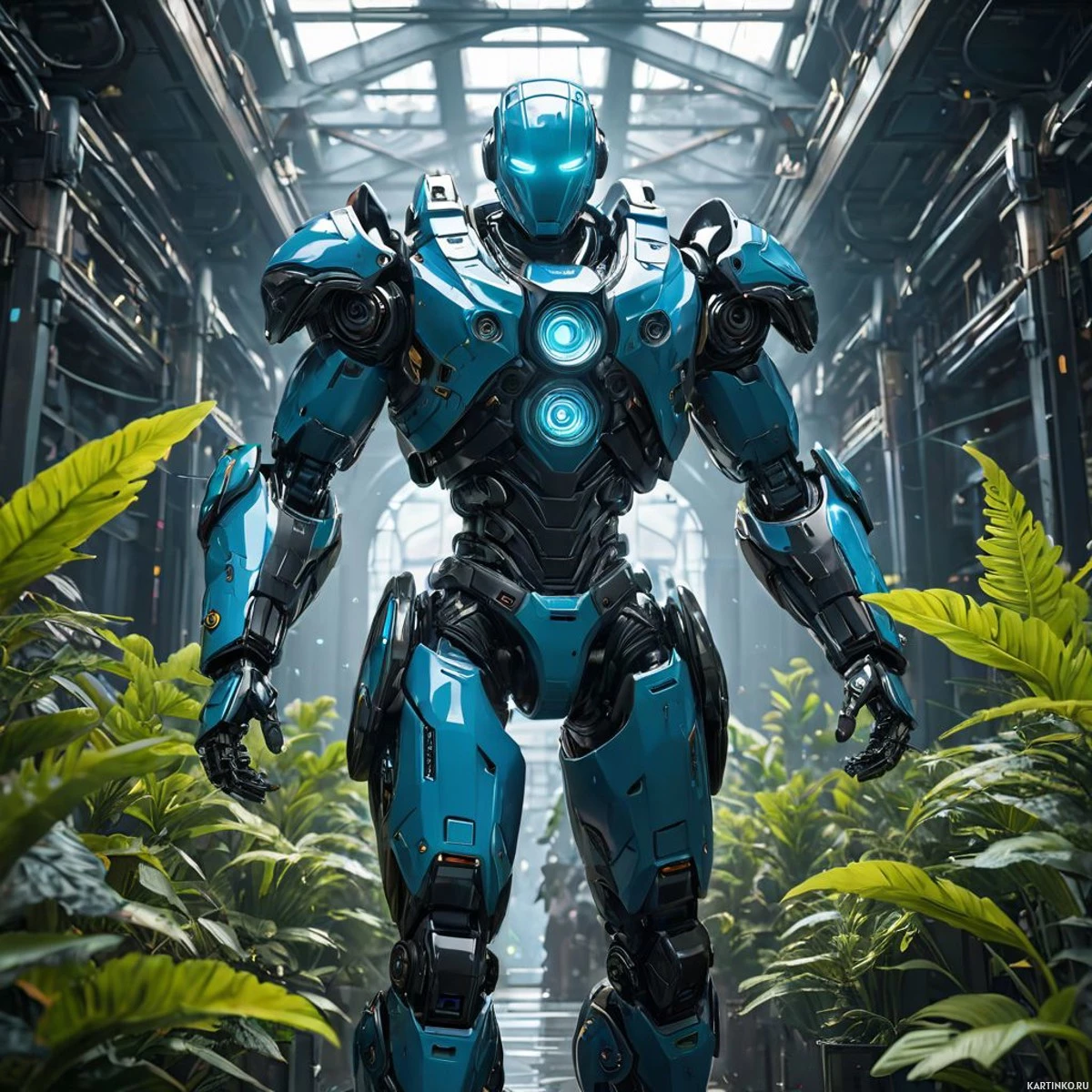 a science fiction setting featuring a robot with a humanoid form. The robot is predominantly blue and gray, with