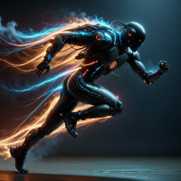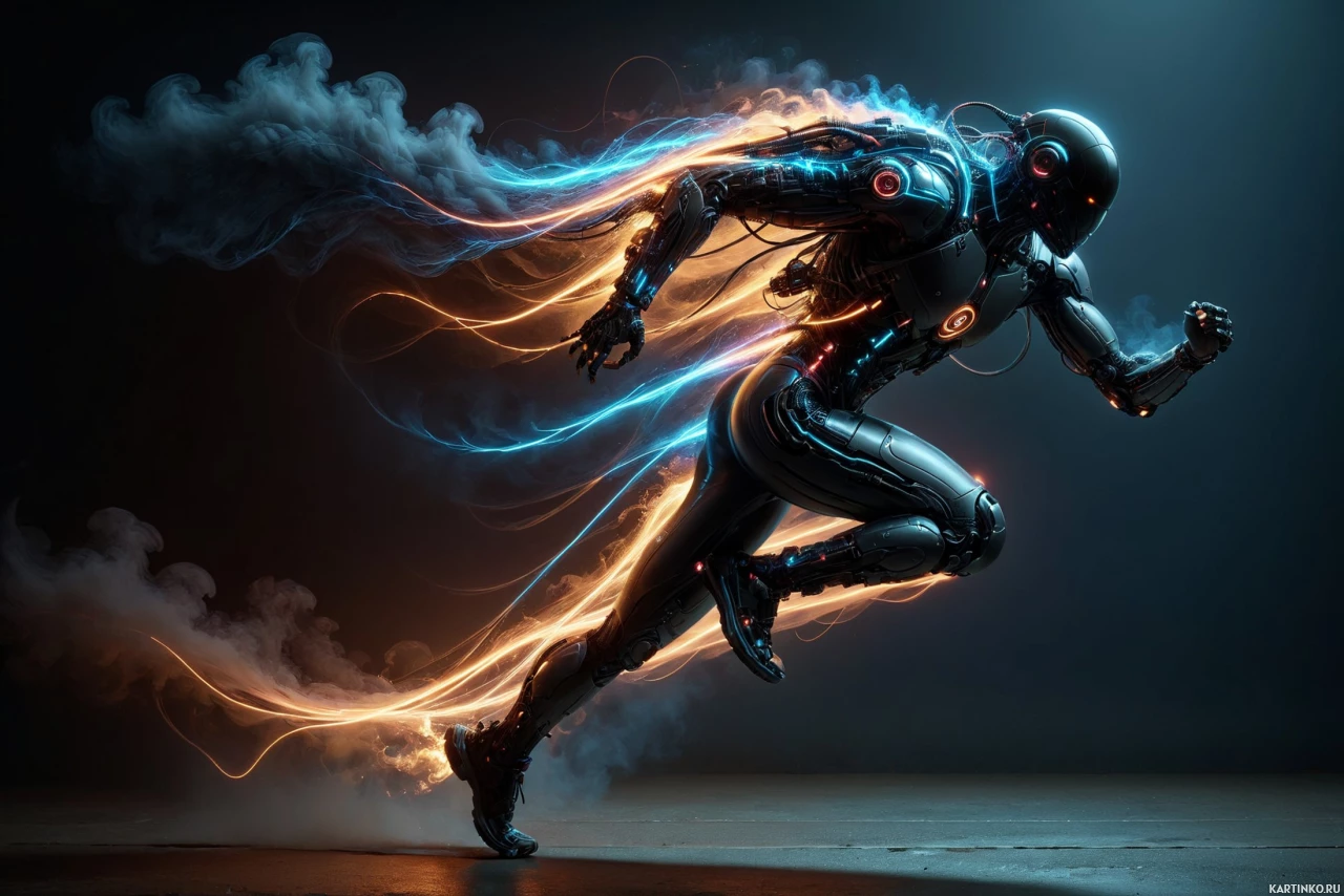На картинке запечатлён футуристичный робот, напоминающий человека, в движении. Левая рука и нижняя часть его тела излучают синий электрический свет, что намекает на высокую скорость или потребление энергии. Правая рука выглядит нормально, без видимого свечения. Головы робота в кадре не видно. Фон состоит из тёмных, облачных элементов, создающих драматический эффект, возможно, изображающих бурю или напряжённую обстановку. Сквозь робота и вокруг него прорываются молнии, усиливающие ощущение скорости и потока энергии. В целом, атмосфера передаёт сцену действия или конфликта в научно-фантастическом сеттинге.