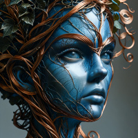 The image features a woman with an artistic makeup design that incorporates leaves and tree branches, suggesting a theme of nature or forest motifs. Her skin appears to be painted in shades of blue, and her lips are a bright red color. She has large, expressive eyes with detailed makeup around them. The design includes the use of metallic gold-colored leaves that seem to blend with the lines of her face and form part of her 'hair'. Her head is not entirely visible, as parts of her hair are replaced by these golden leaves. There is a subtle texture on her skin that resembles tree bark or roots. The overall style of the image appears to be fantasy-inspired, with attention to detail in the application of makeup and the incorporation of natural elements into the design. The woman's pose and expression are neutral, allowing for a focus on her intricate appearance.