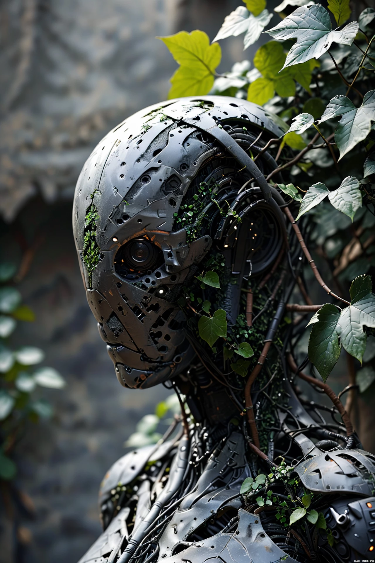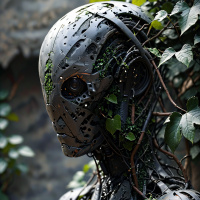 На картинке изображен робот, напоминающий человека, стоящий среди растительности: много листвы и дерево с зеленой листвой. У робота видны голова и лицо с глазами и ртом, а также механические детали. На его поверхности есть зеленая мхом покрытая поверхность, что говорит о том, что он долгое время находился на открытом воздухе. Цветовая гамма выдержана в серых тонах, что контрастирует с зеленью вокруг.