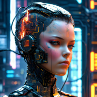 На картинке изображена девушка в научно-фантастическом сеттинге. У нее сложная, механически усовершенствованная фигура, с элементами, свидетельствующими о передовом технологичном вмешательстве в ее физиологию. Выражение лица нейтральное, и она смотрит прямо на зрителя. На заднем плане видны детали, напоминающие цифровые интерфейсы или панели управления, что усиливает технологическую тематику картинки.