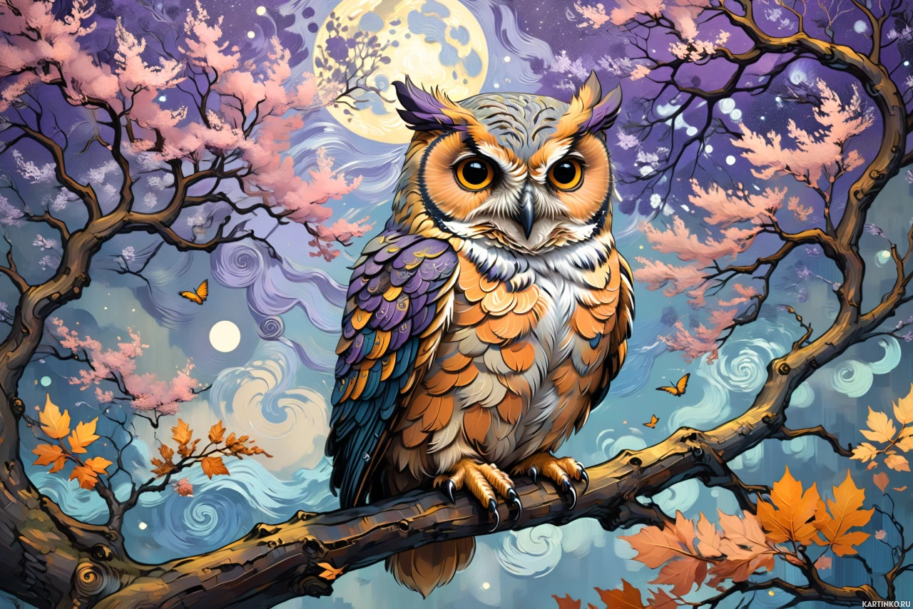 На картинке величественная сова сидит на ветке, усыпанной яркими осенними листьями. Голова совы повернута вправо, словно она смотрит вдаль. На заднем плане – спокойное ночное небо, освещенное полной луной. Лунный свет мягко заливает всю сцену, создавая волшебную атмосферу. Цветовая гамма состоит из холодных синих и фиолетовых оттенков на фоне, контрастирующих с теплыми оранжевыми и желтыми цветами осенних листьев и перьев совы. В левом верхнем углу видны нежные розовые акценты, напоминающие цветущую вишню. Общая композиция создает ощущение спокойствия и очарования.
