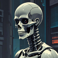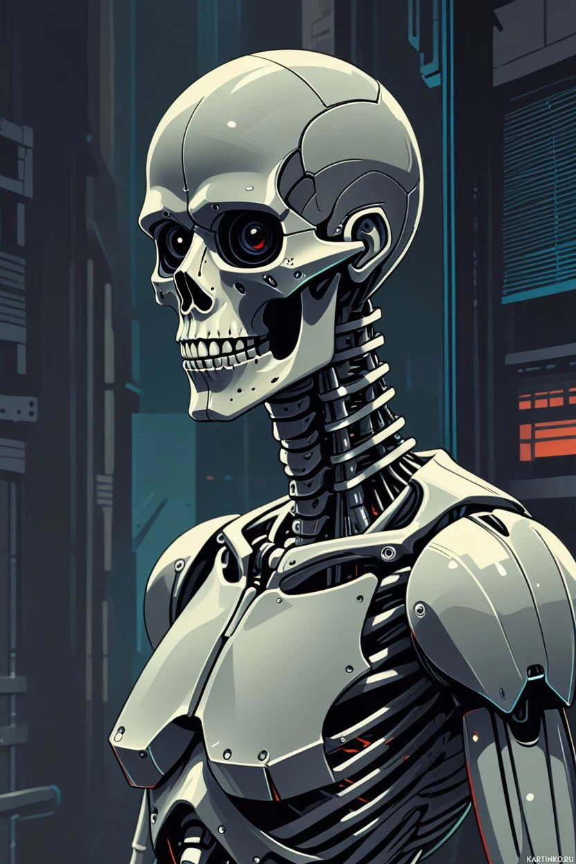 science fiction themes, where robots and artificial intelligence are explored as part of human evolution, ethics, or societal impacts. The juxtaposition of a skeleton within the robot's design may evoke thoughts about mortality, lifelessness, and the nature of consciousness in machines. The image does not contain any textual elements that would provide additional context or information about the setting, characters, or intent behind its creation.