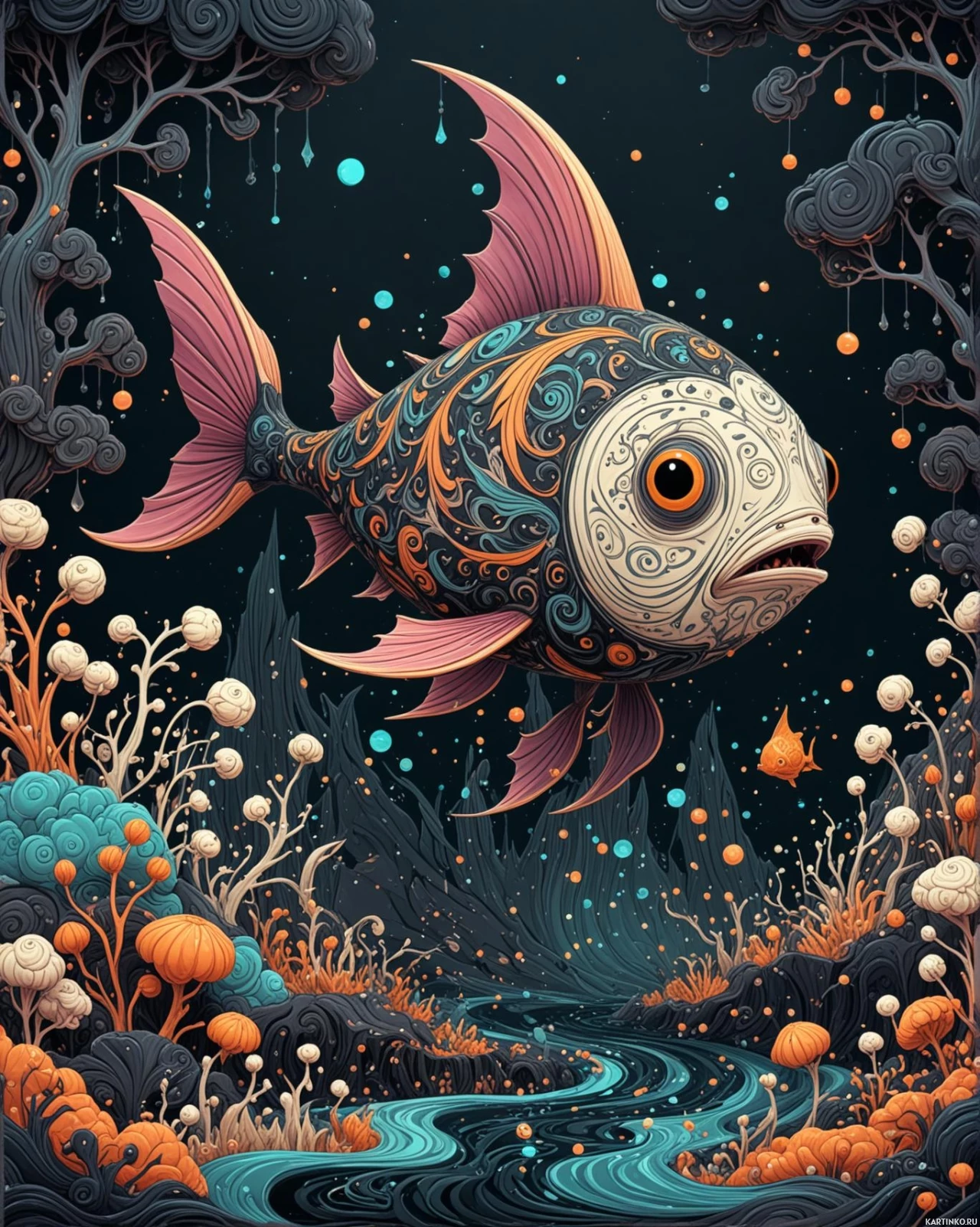 На картинке изображена антропоморфная рыбка с человеческим лицом, стоящая на двух ногах у ручья. У рыбки большие глаза и лёгкая улыбка. Она выполнена в различных цветах, включая розовый, синий и жёлтый, с узорами, напоминающими чешую или даже кристаллическую структуру. На заднем плане – ночное небо, полное звёзд и других небесных тел, что создаёт ощущение внеземного пейзажа. Справа видна большая дерево с замысловатыми резными узорами или рисунками на стволе. В ландшафте присутствуют камни разных размеров, а в левом нижнем углу видны грибы. Общий стиль картинки тяготеет к жанру фэнтези или сюрреализма, с яркими цветами и детальной прорисовкой теней, которые придают глубину сцене.