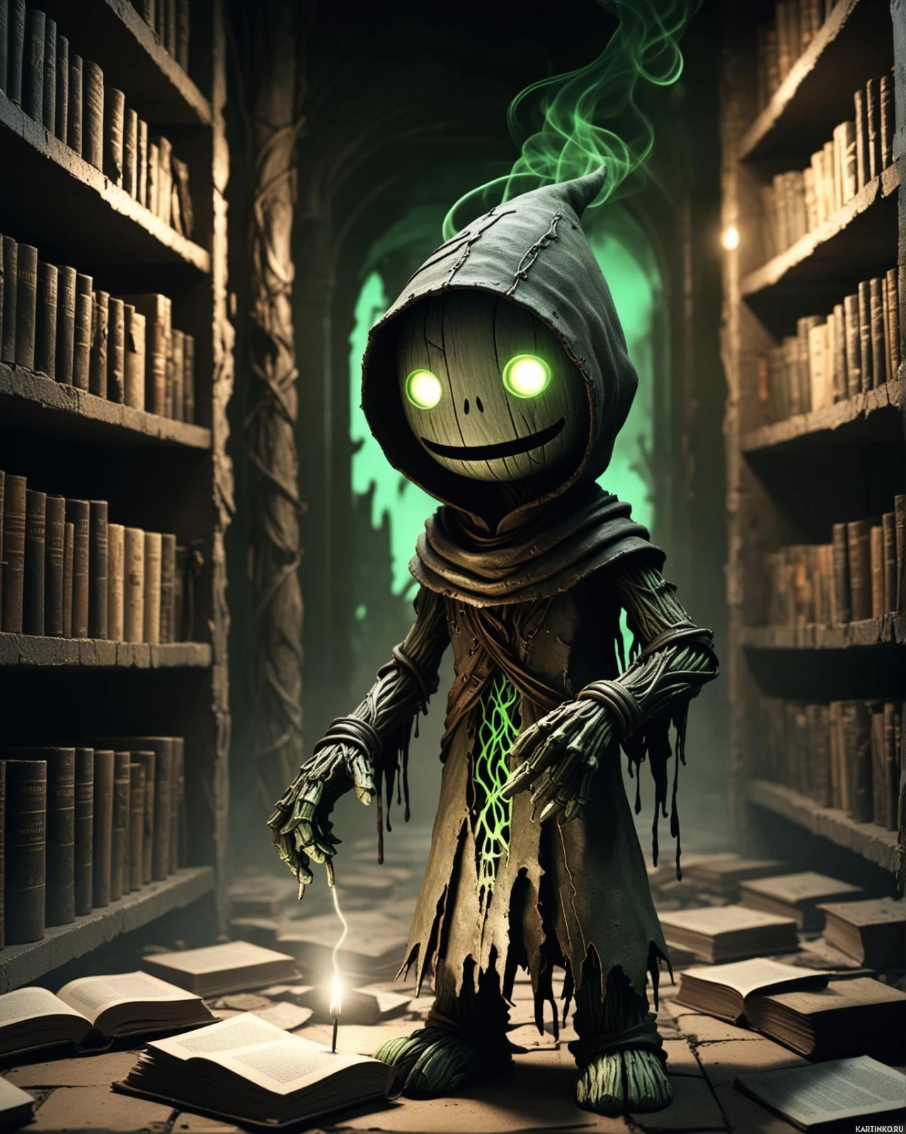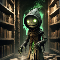 На картинке изображен персонаж в стиле фэнтези, стоящий в библиотеке. Это антропоморфное существо с большими ушами и светящимися глазами. На нём накинуто одеяние с капюшоном, скрывающим голову, что придаёт ему таинственный вид. Левая рука протянута к земле, где, кажется, он только что положил книгу или манускрипт, из которого вырываются искры, намекая на магическое взаимодействие. На заднем плане виден арочный проем и полки, заставленные аккуратно расставленными книгами, что указывает на порядок и организованность библиотеки. Справа в помещение проникает толстый ствол дерева, добавляя к общей фантастической атмосфере. Освещение приглушённое, с зеленоватым оттенком, возможно, это ранняя утренняя пора или библиотека слабо освещена. Судя по искрам, идущим от руки персонажа и книги, с которой он взаимодействует, он занят чем-то волшебным или магическим.