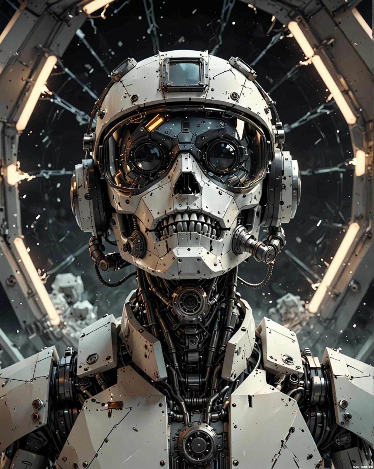 На картинке изображён гуманоидный робот с массивной, детализированной головой в виде черепа, являющейся частью его конструкции. Тело робота сложено из механических деталей, что отсылает к научно-фантастической тематике. Видны электронные компоненты и шарниры, указывающие на его роботизированную природу. Вокруг центральной фигуры расположены более мелкие роботы, также выполненные в схожей стилистике: механические конструкции и металлические поверхности. Фон тёмный, выделяя подсвеченные "лица" этих роботов и создавая жутковатую или футуристическую атмосферу.