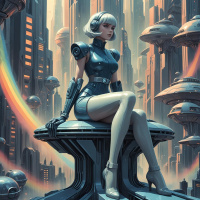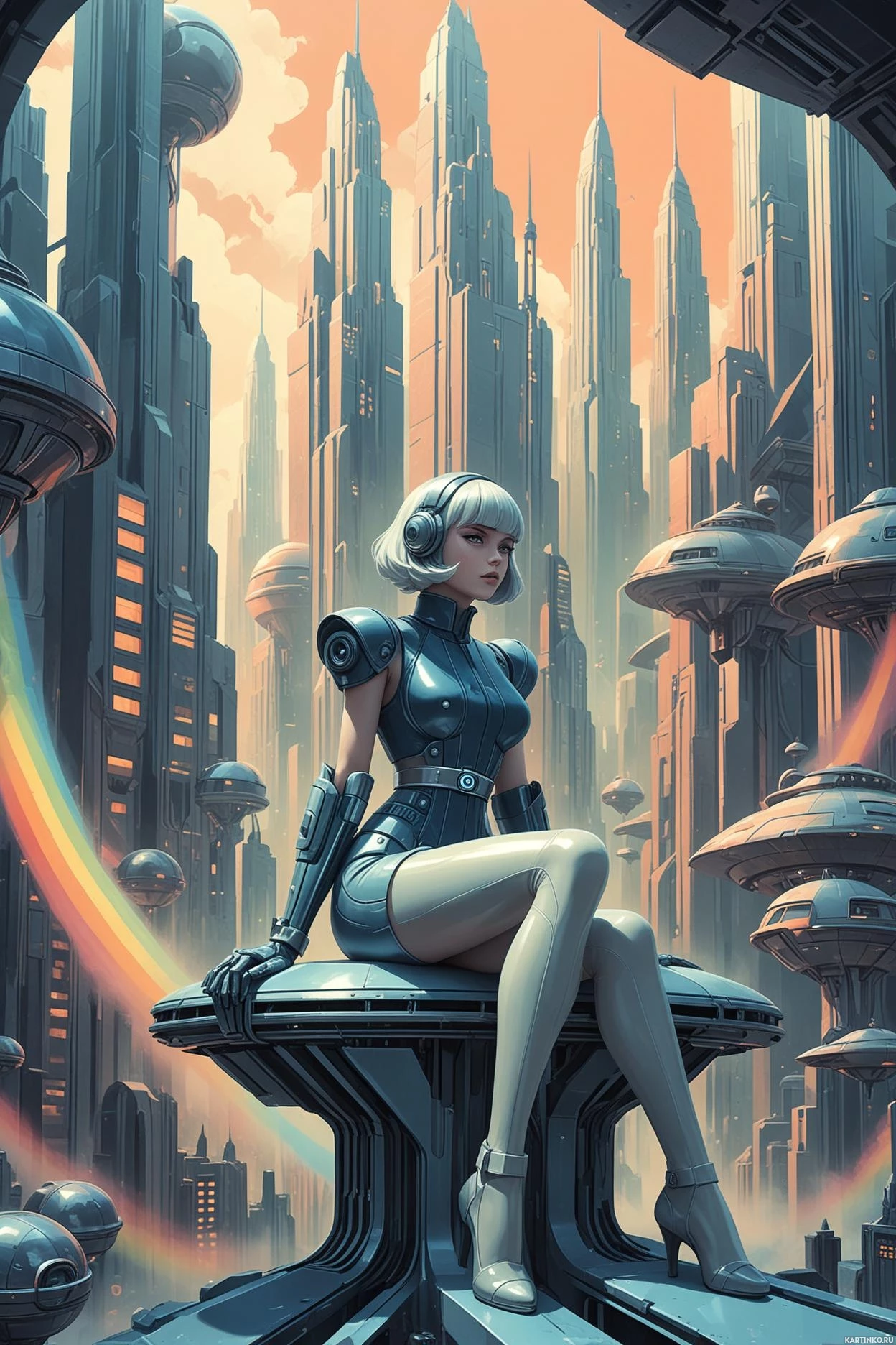 На картинке изображена женская фигура, сидящая на возвышении в футуристическом окружении. У неё белые волосы, а на ней бронированный костюм с наплечниками и шлемом, в который встроено, похоже, устройство связи. Вокруг – густонаселённый пейзаж из высоченных сооружений, напоминающих замки и соборы, выполненных из металла и камня с вкраплениями механических элементов. Над головой – пасмурное небо, создающее ощущение сумерек или рассвета. Справа от фигуры тянется радуга, контрастирующая с преобладающей монохромной гаммой серых и черных тонов.