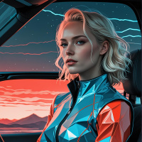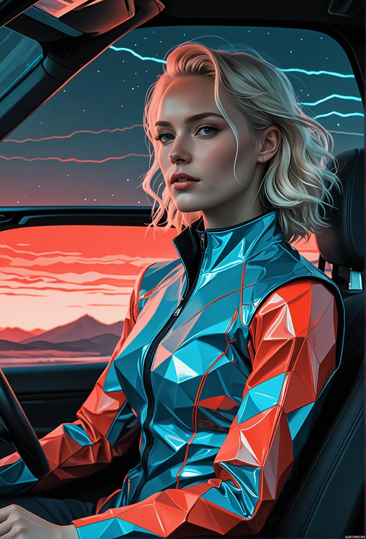На картинке молодая женщина с светлыми волосами сидит в машине. На ней комбинезон, цветовая гамма которого напоминает костюм Капитана Marvel. Теплый свет, льющийся из салона автомобиля, подсвечивает ее и интерьер. За окном – драматичное небо с оттенками оранжевого и красного, словно на заре или закате.
