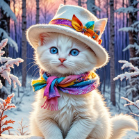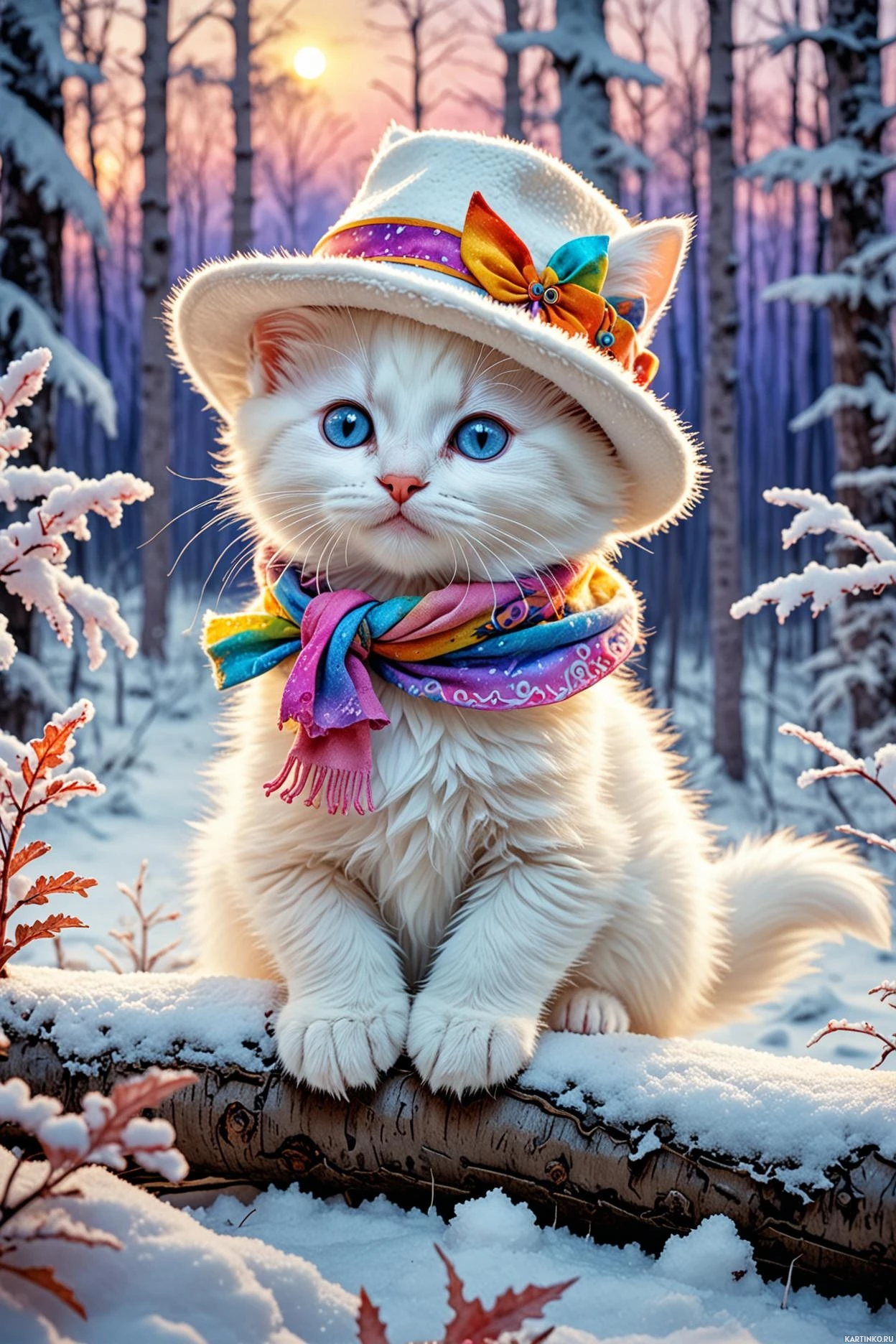 In the image, a white cat with striking blue eyes sits on a rock amidst a forest. The cat is adorned with a pink scarf and a matching hat. The forest around it is blanketed in snow, creating a serene winter scene. In the background, a majestic tree can be seen standing tall, adding to the overall atmosphere of the picture.
