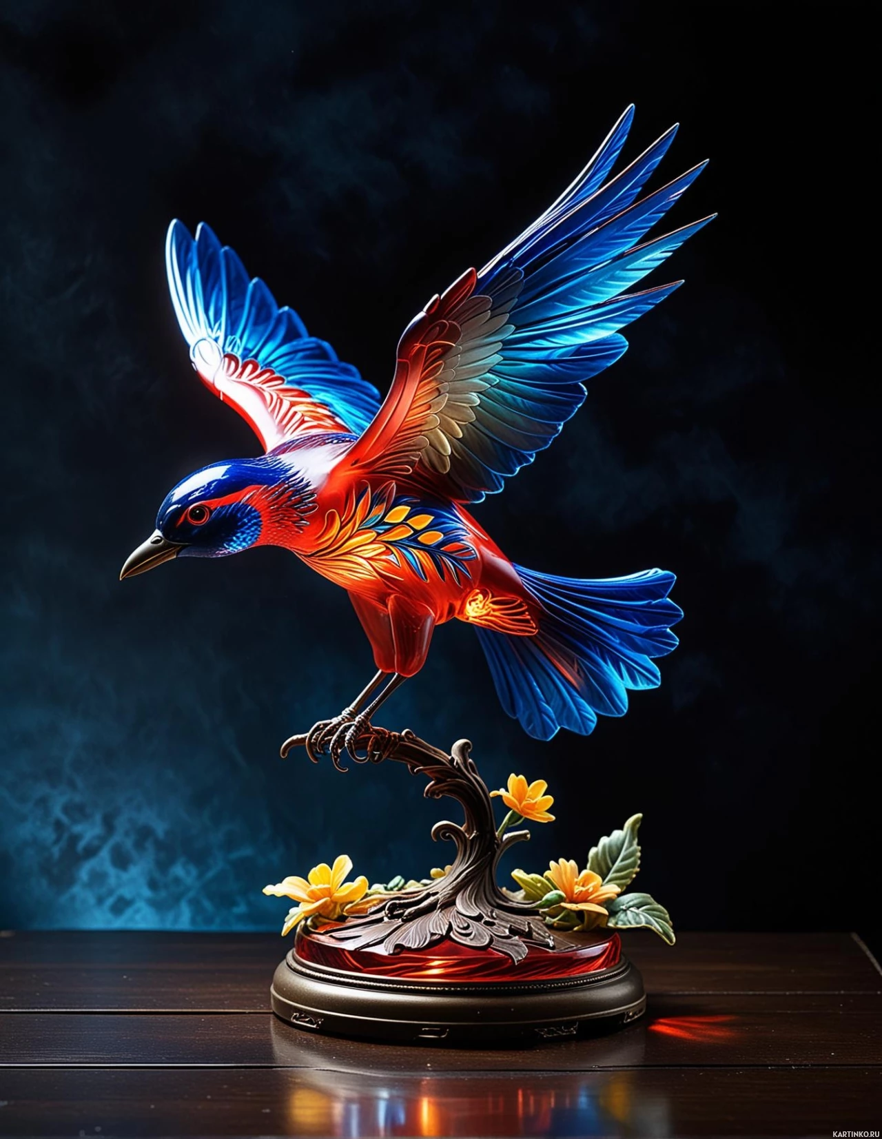 На картинке представлена трехмерная скульптура птицы с раскидистыми крыльями и хвостом, выполненная в ярких цветах: синем, красном и жёлтом. Птица стоит на небольшом постаменте, украшенном элементами, напоминающими растительные орнаменты. Фон тёмный, возможно, чёрный, что создаёт контраст с яркой птицей и усиливает её визуальное воздействие. Детализированные перья позволяют предположить, что это редкий вид.