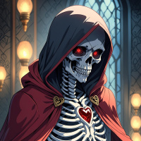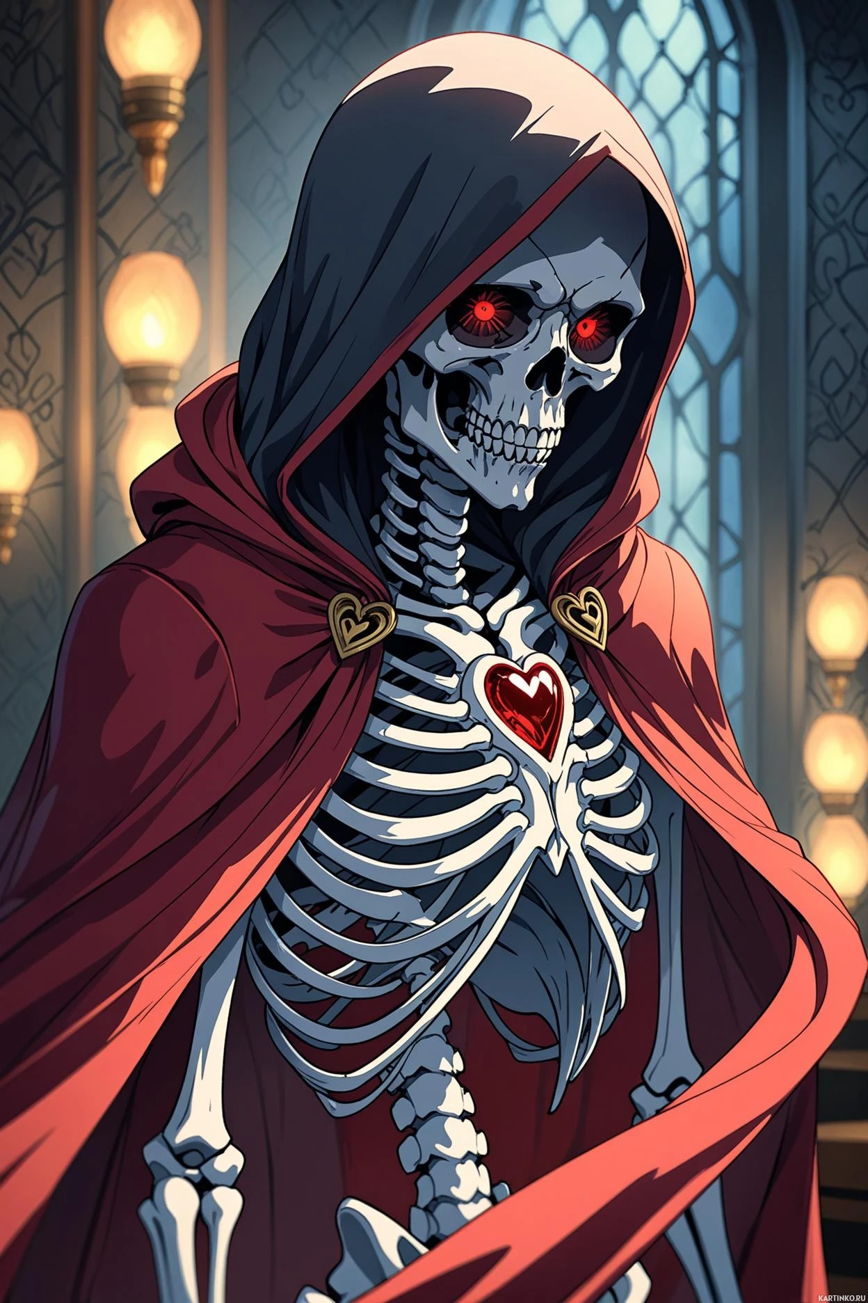 На картинке изображена фигура, похожая на скелет, облаченного в одеяния. На нём красный плащ с золотым сердцем посередине, и на голове — капюшон. Персонаж стоит на фоне интерьера, выполненного в готическом или средневековом стиле, с тёмными тонами и, возможно, видимыми вдали горящими свечами или факелами.