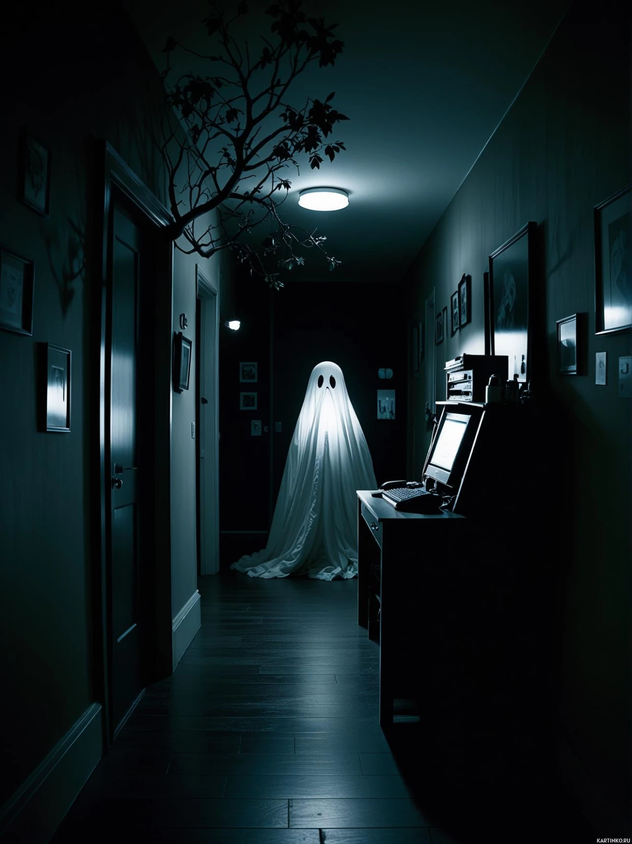 На картинке – бледная, словно сотканная из тумана, фигура призрака стоит в интерьере коридора. Коридор слабо освещен потолочными светильниками и отделан темными деревянными панелями. Слева видна дверь, приоткрытая так, будто приглашает войти в комнату за ней. Справа стоит небольшой столик с лампой, а на стене позади виднеются рамки с фотографиями. Призрак расположен почти в центре картинки, создавая ощущение загадочности и таинственности того, что скрывается за ним.