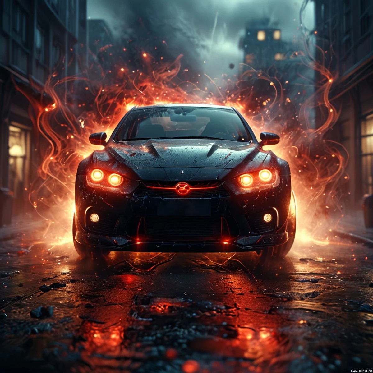a city street. Surrounding the car are flames or sparks, giving the impression that the vehicle is moving at