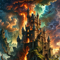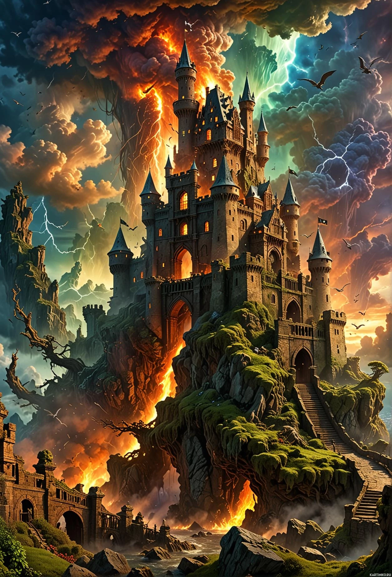 В центре картинки – величественный замок, примостившийся на скалистом выступе и возвышающийся над огненной гладью воды. Замок состоит из множества башен и башенок, все они залиты теплым оранжево-красным светом, исходящим от пламени внизу. Над замком – драматичное небо, затянутое темными грозовыми тучами, а молнии освещают сцену изнутри. Вдалеке видны птицы, парящие в небе, добавляя ощущение движения и жизни посреди хаоса.