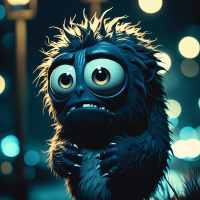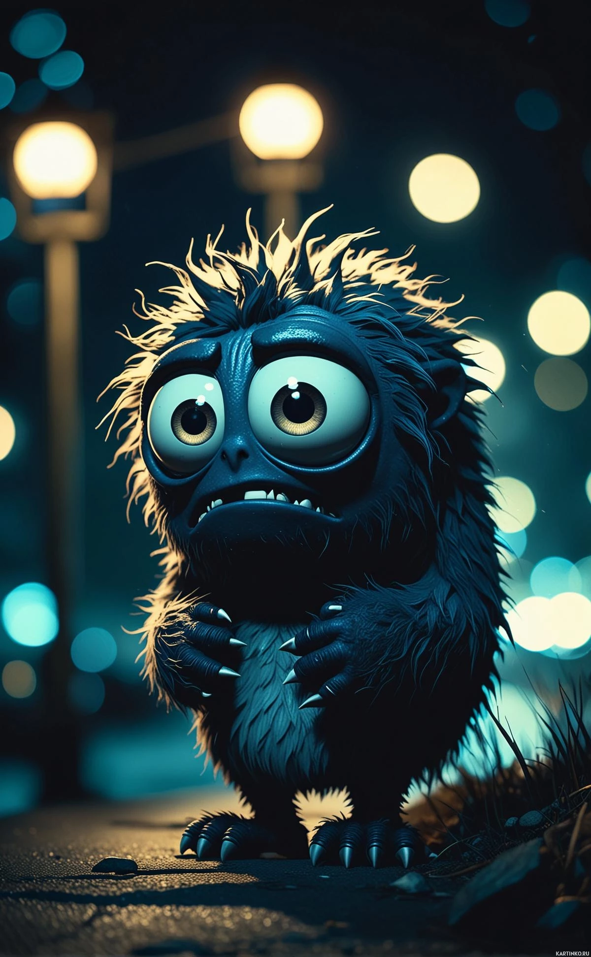 На картинке стоит синее существо с торчащими волосами и большими глазами, на ночной улице. Монстр сцепил руки, словно от удивления или в ожидании чего-то. Он стоит под сводом тускло горящих фонарей, которые отбрасывают жутковатое свечение на всю сцену. Фон темный, выделяя существо и создавая ощущение тайны, скрывающейся за его пределами.