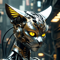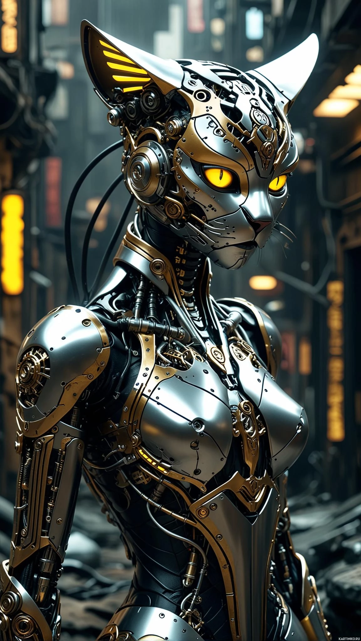 На картинке изображен робот, созданный в облике кошки с человеческими чертами, на фоне научно-фантастического пейзажа, похожего на антиутопию или индустриальную зону. У робота голова, стилизованная под кошачью, с заостренными ушами и светящимися желтым цветом глазами. Тело его – гуманоидное, но сохраняет обтекаемые линии и металлический блеск, характерные для робототехнических конструкций. Робот украшен сложными механическими деталями, намекающими на передовые технологии или кибернетику.