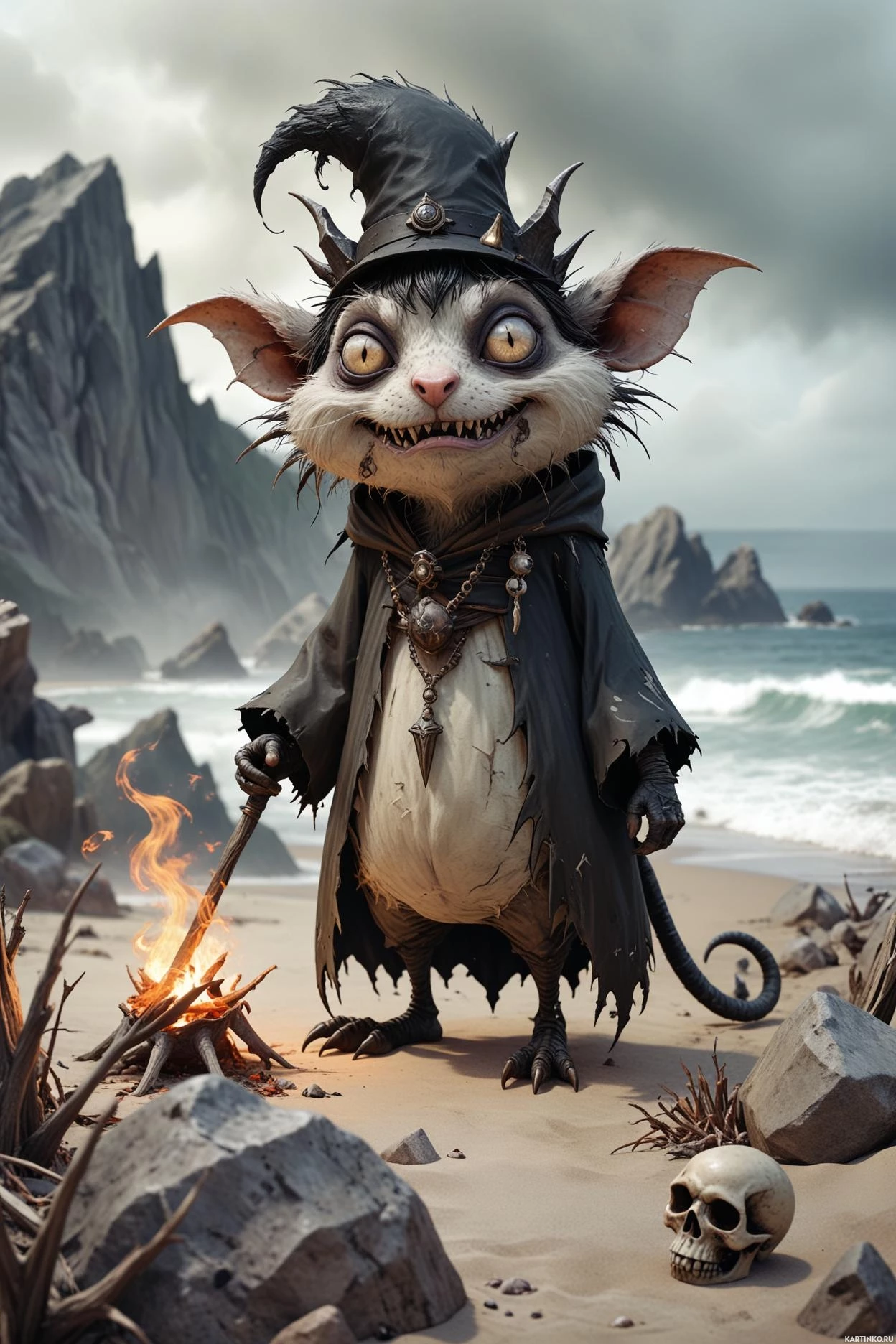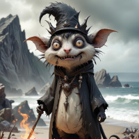 an anthropomorphic creature standing on a beach. This creature has a prominent witch's hat and appears to be in the midst of casting a spell, as evidenced by the fire at its feet. It is set against a backdrop that includes