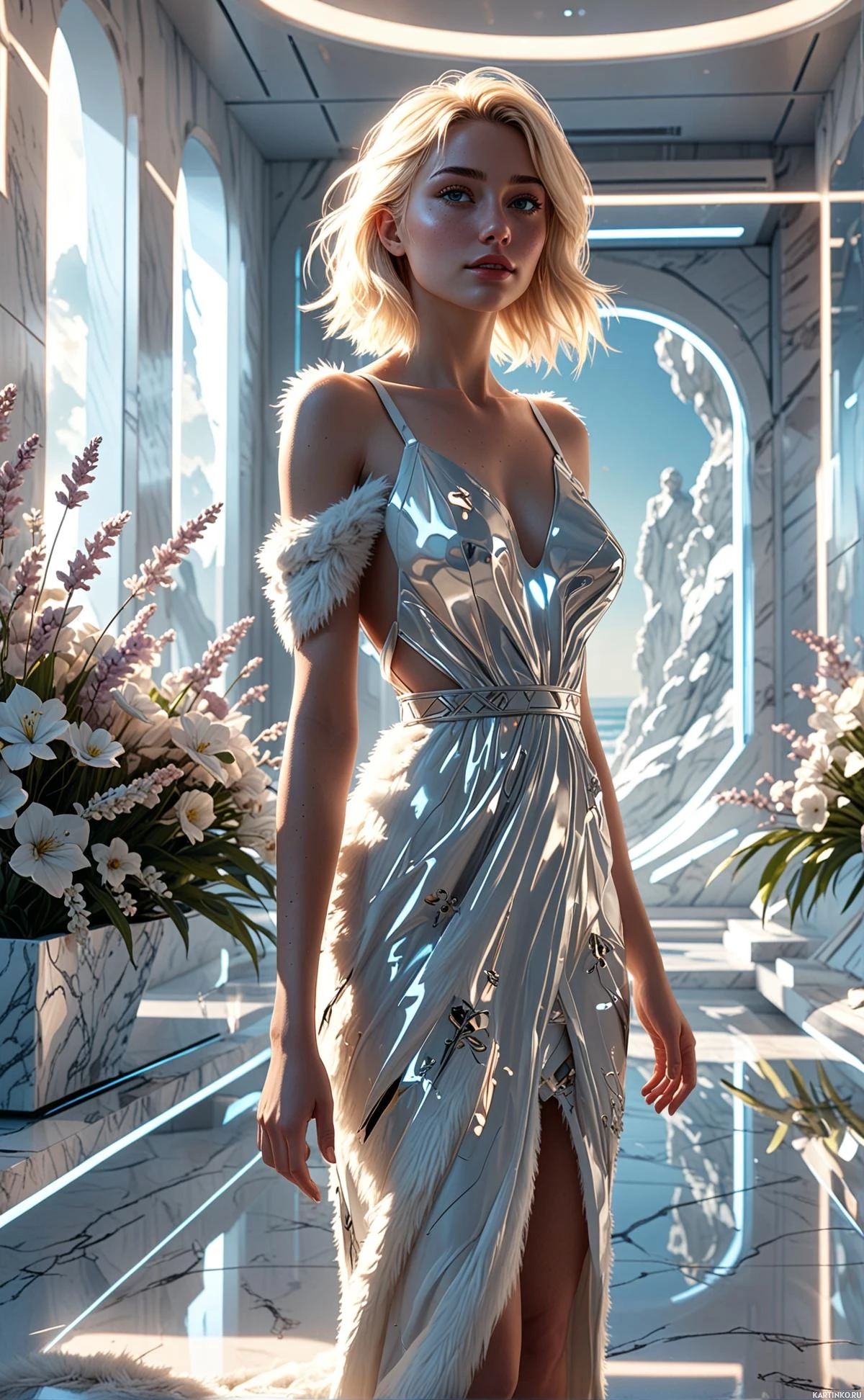 natural beauty to the otherwise modern setting. The lighting highlights the shiny quality of her dress, emphasizing its
