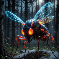 a humanoid torso with arms, but it also possesses the wings, antennae, and other features commonly associated with insects like a bee or a dragonfly. Its eyes glow