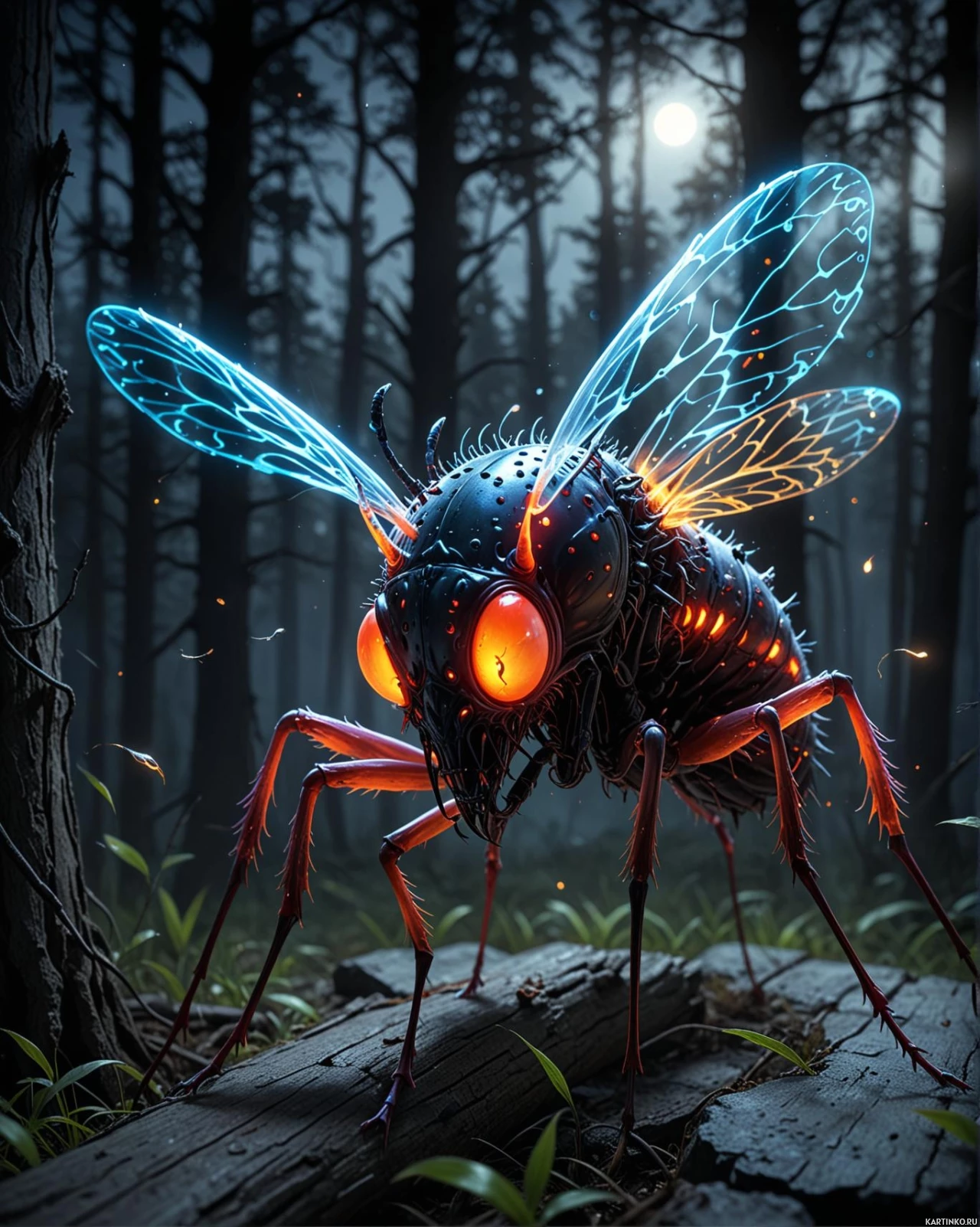 The image depicts a fantastical creature that appears to be a fusion of a human and an insect, set in a forest under