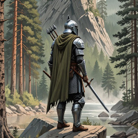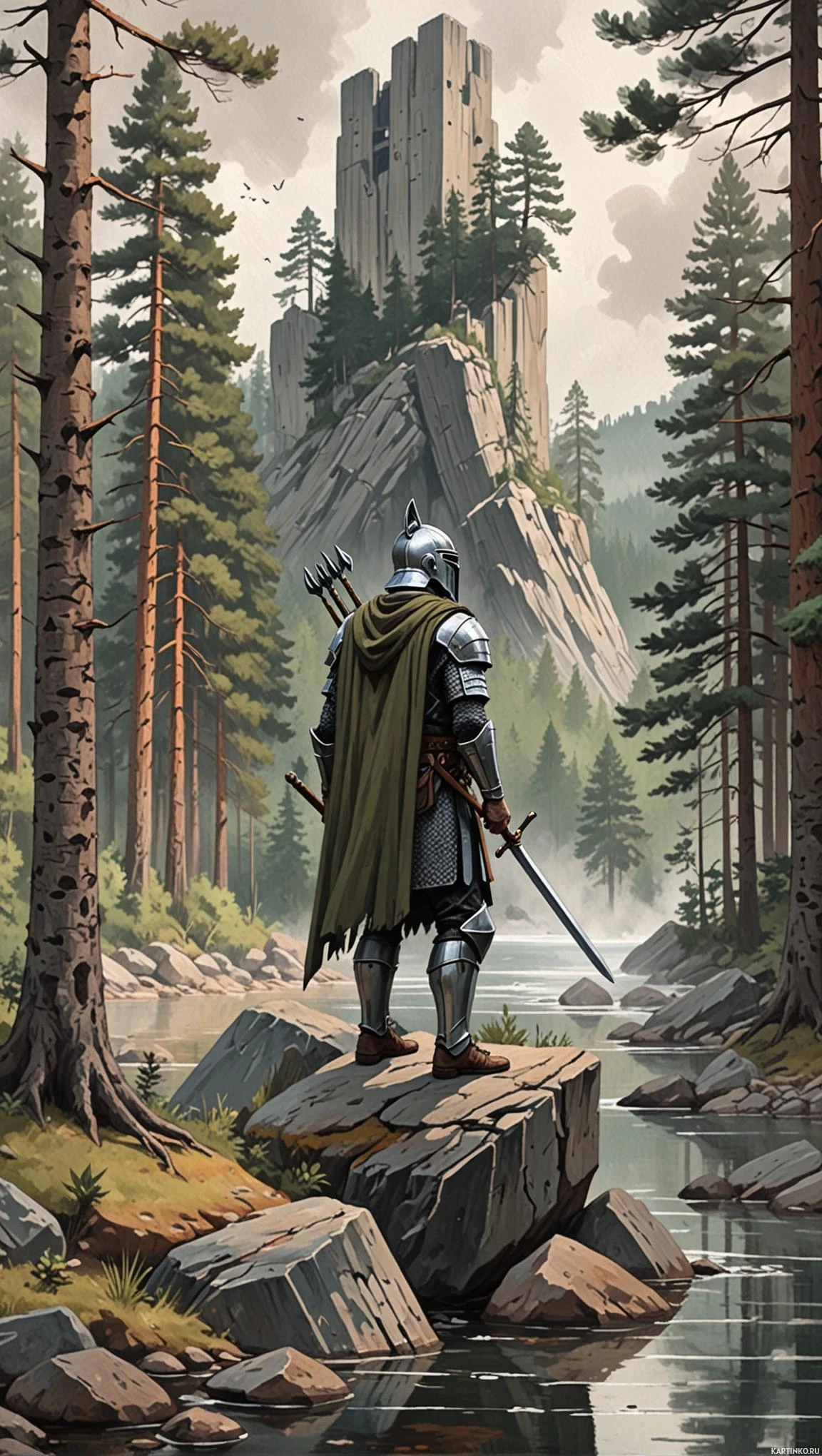 a body of water, possibly a river. The warrior is dressed in armor and holds a sword in one hand and the hilt of another weapon in the other, suggesting they are prepared for combat. The setting appears to be a forest with