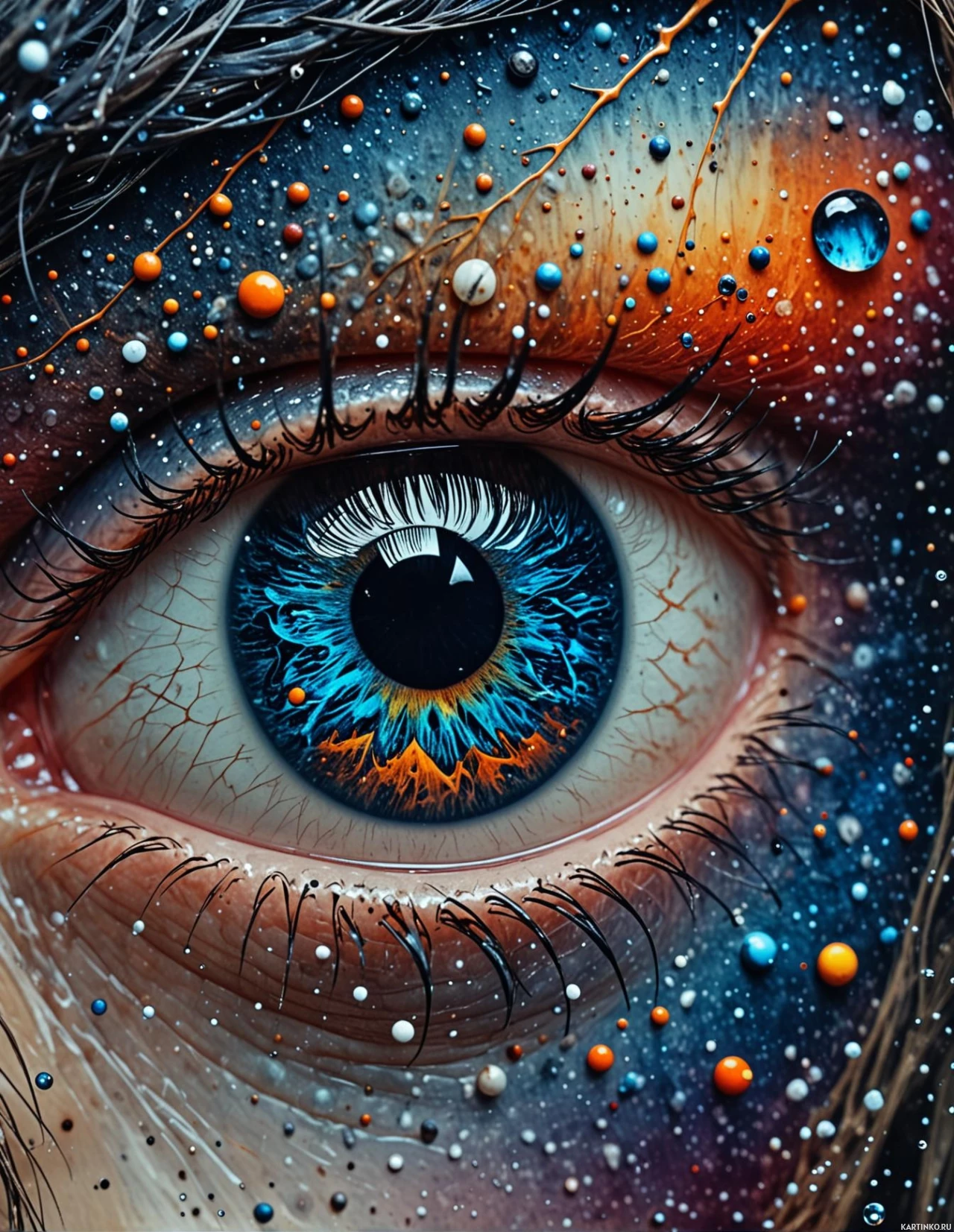 Картинка показывает крупный план человеческого глаза с ярким синим склером, окружённым множеством цветных точек, напоминающих мерцание ночного звёздного неба. Вокруг глаза – радуга красок, где преобладают синие и фиолетовые оттенки. Цвета яркие и кажутся парящими в воздухе.
