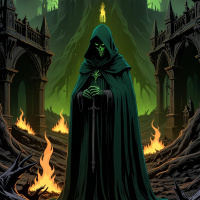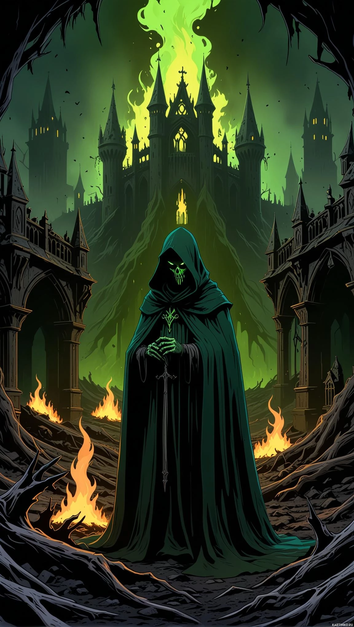 На картинке – фантастическая сцена, пронизанная зловещей атмосферой. На переднем плане – фигура, скрытая под темной накидкой, держащая в руках, похоже, посох или волшебную палочку. Голова покрыта капюшоном, скрывающим лицо и добавляющим загадочности образу. Человек стоит на неровной земле, усыпанной тлеющими углями, словно после пожара. За его спиной возвышается внушительное здание, похожее на замок, окутанное мрачными тучами, усиливающими жутковатую атмосферу. Архитектура здания величественна и выполнена в готическом стиле, с высокими шпилями, уходящими в грозовое небо.