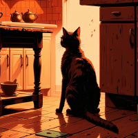 На картинке изображена интерьерная сцена, похоже, кухня, залитая дневным светом. Естественный свет проникает через окно слева, отбрасывая тени и освещая разные части комнаты. На переднем плане – кот, сидящий на полу перед деревянным шкафчиком со стеклянными дверцами. Внутри шкафчика видно одну миску. Шкафчик имеет резной декор с закругленными краями и расположен по центру кадра. Справа – плита с ручками, вытяжка и различные кухонные принадлежности и емкости: кастрюли, сковородки, миски, чашки, ложки и бутылки. Пол выложен квадратной плиткой, возможно, керамической или каменной.
