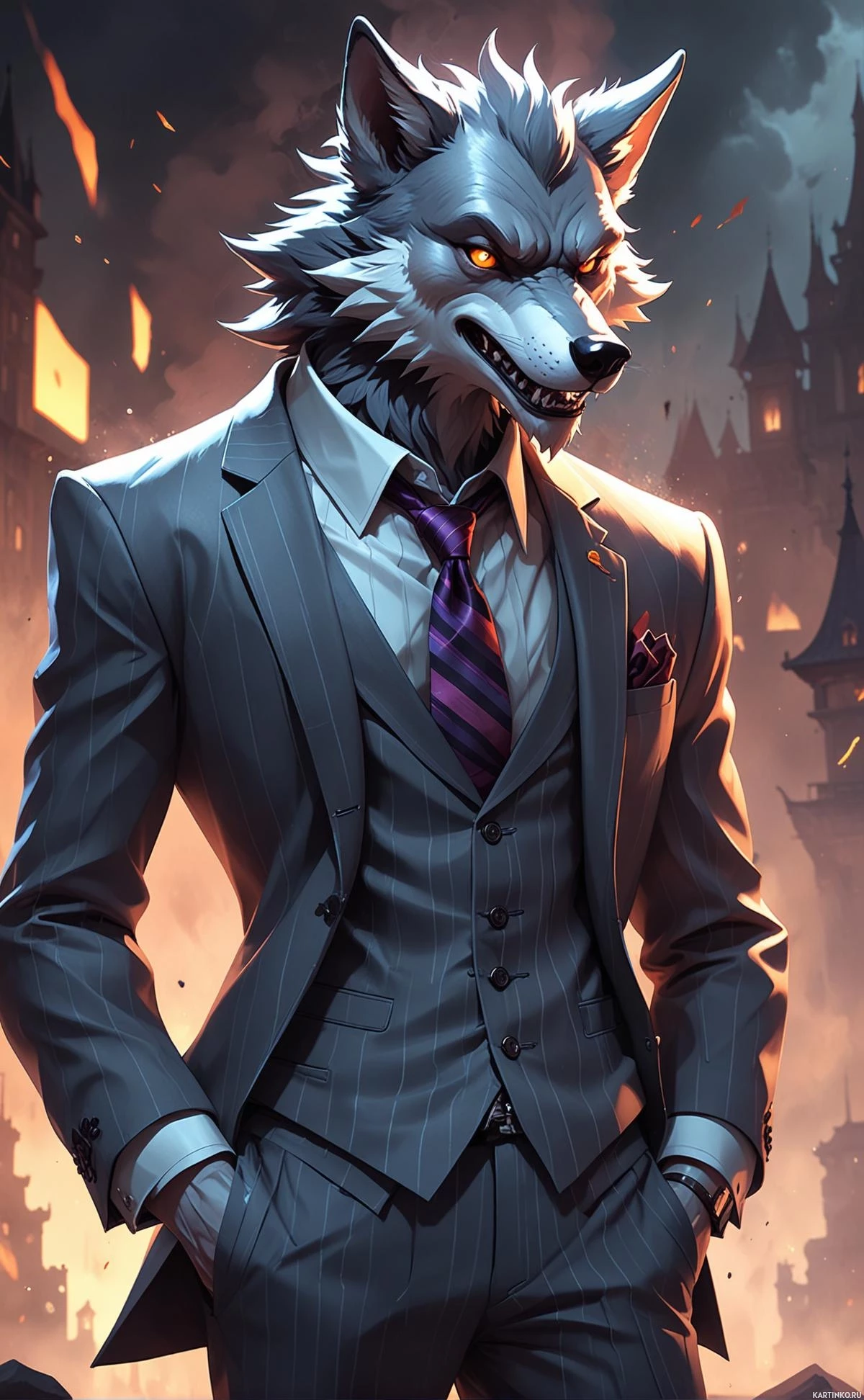 The image depicts an anthropomorphic wolf character wearing a dark suit and tie, standing confidently with hands in pockets and looking directly at the viewer. The background is dramatic with dark tones and what appears to be flames or fiery elements, suggesting a theme of intensity or danger.