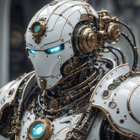 a metallic body that looks to be made of polished steel or iron, and features such as mechanical joints and circuitry visible on the surface are highlighted by blue illumination. The robot's head is sleek and angular with glowing
