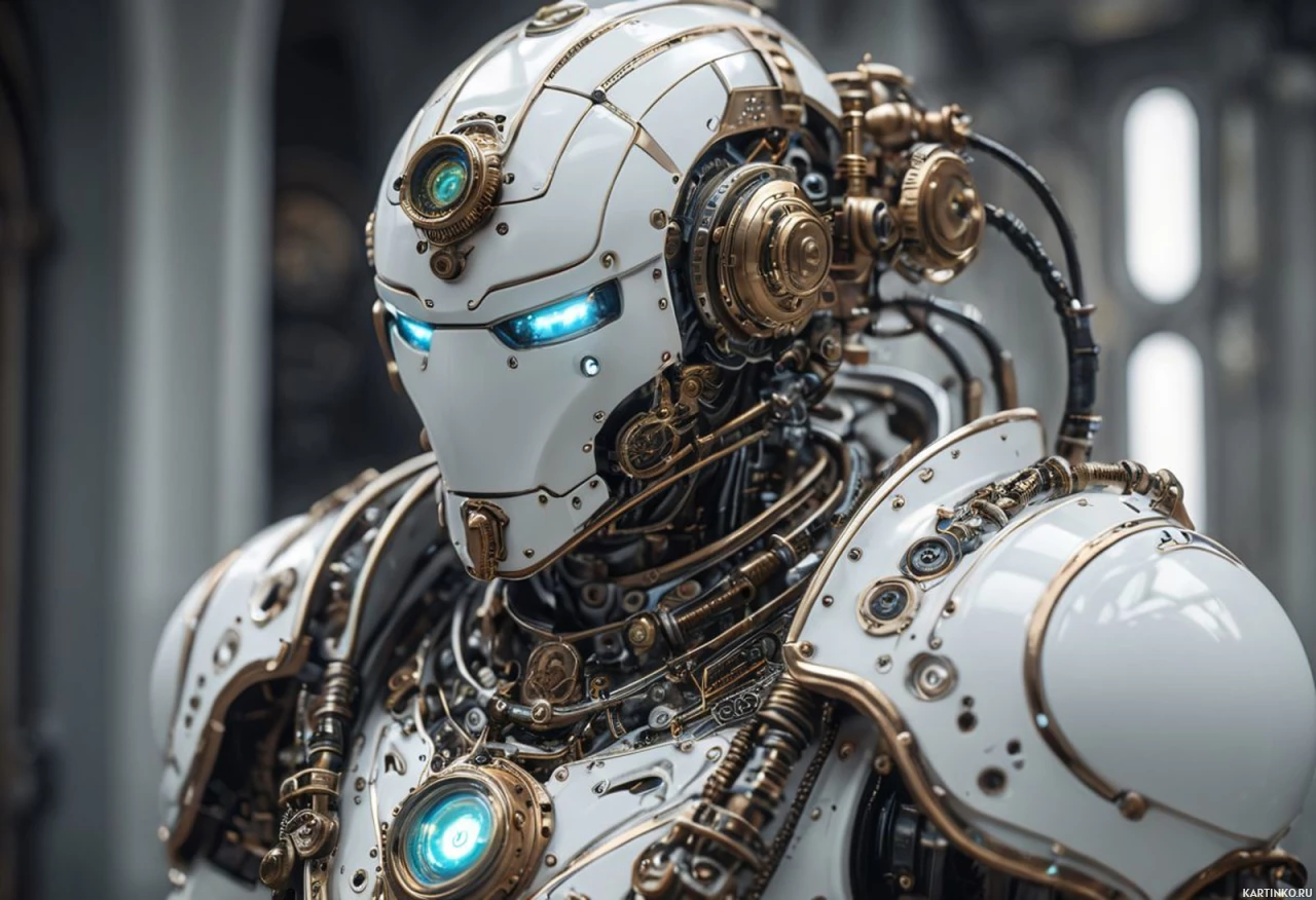 blue eyes that provide a stark contrast against the white and grey color scheme of its body. It wears armor-like plates around its shoulders, suggesting a protective function or possibly for combat. The background suggests an industrial setting with high ceilings and artificial lighting, which could be part of a space station or advanced facility given