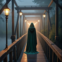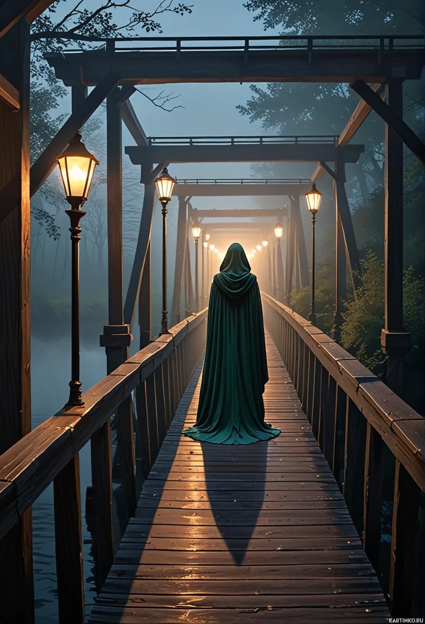 На картинке запечатлен силуэт, стоящий на мосту ночью. На нём накинут плащ с капюшоном, скрывающим лицо, что создаёт ощущение анонимности или таинственности. Перед ним горят фонари, освещающие путь. Атмосфера картинки пронизана туманом или дымкой, добавляя ощущение загадочности и напряжения.