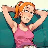 a blue couch, while her left arm is relaxed by her side. The character is seated with one leg crossed over the other, creating a casual and relaxed pose. The background is plain and does not contain any additional detail or context.