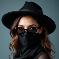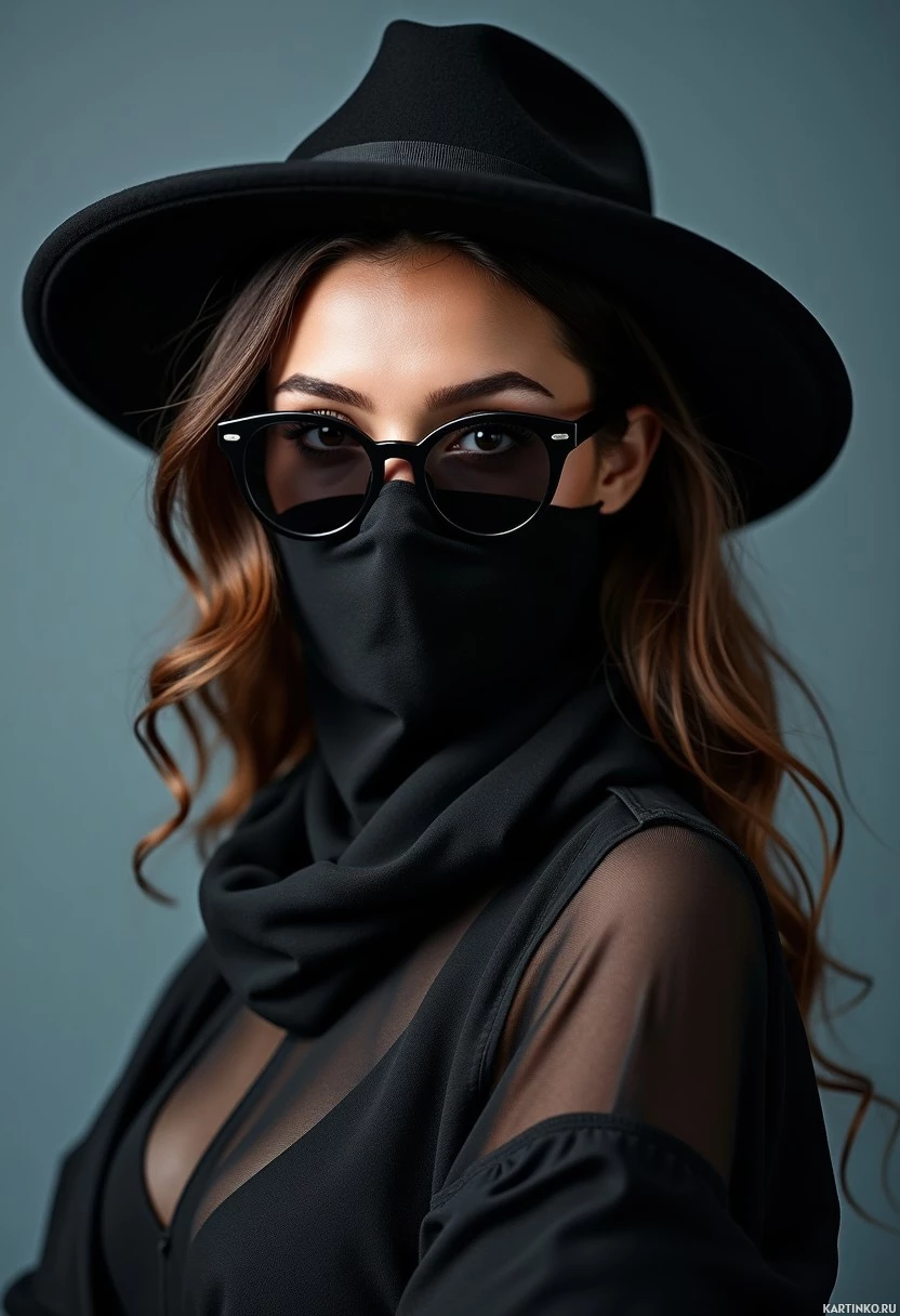 The image shows a person wearing a black hat with a wide brim, sunglasses that cover the eyes, and a face mask covering the mouth and nose area. The individual is also wearing a long-sleeved top with sheer paneling at the chest and an off-the-shoulder design. The background appears to be neutral in color, providing a stark contrast to the dark clothing of the person.