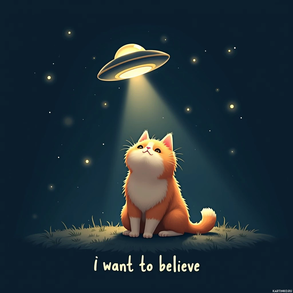 На картинке сидит рыже-белый кот с полосатой шерстью на травке под ночным небом. Кажется, он смотрит вверх с открытой пастью, словно зевает или от волнения. Над головой у кота – подсвеченное инопланетное судно с куполом, из которого падает луч света на землю, где он находится. Эта сцена создает игривую и фантазийную атмосферу, отсылающую к темам, часто связанным с кошками и встречами с внеземными цивилизациями в популярной культуре. Цветовая гамма и освещение добавляют картинке сюрреалистичности.