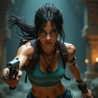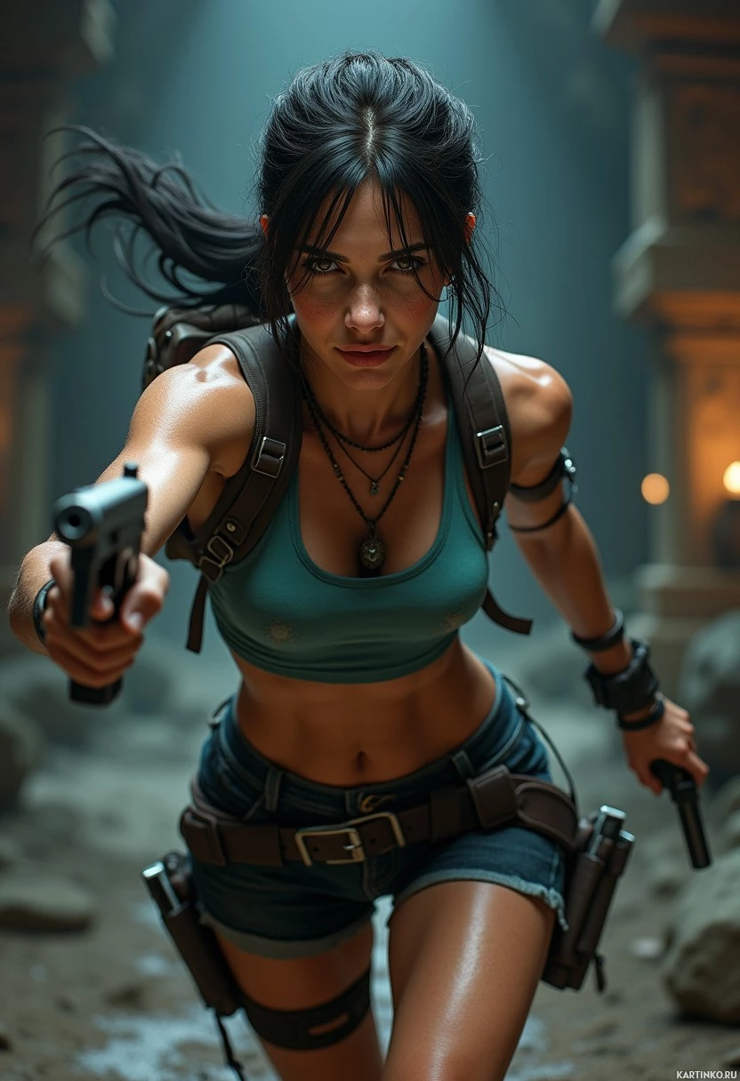 На картинке изображена женская героиня, похоже, в промо-ролике или динамичной сцене для видеоигры или фильма. Она держит пистолет обеими руками, направляя его на зрителя, с серьезным и напряженным выражением лица. У нее короткие темные волосы и она одета в топ и шорты, демонстрирующие ее подтянутую фигуру. На шее у нее кожаный ошейник, что может намекать на роль в приключенческой или экшен-игре. Вокруг нее – пейзаж, напоминающий храм или руины, с горящими факелами на стенах, создающими атмосферу древности и таинственности.