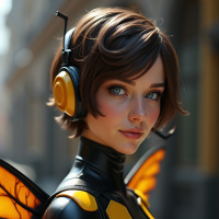 The image shows a female character with a stylized appearance reminiscent of video game or comic book art. She has short brown hair and is wearing headphones around her neck. The character is dressed in an outfit that includes a black and yellow bodysuit, resembling the armor worn by the character known as "Yellow Wing." Her skin appears to be fair, and she has blue eyes with visible eyeliner. She is standing on a street pavement, and there are buildings and signs in the background suggesting an urban setting.