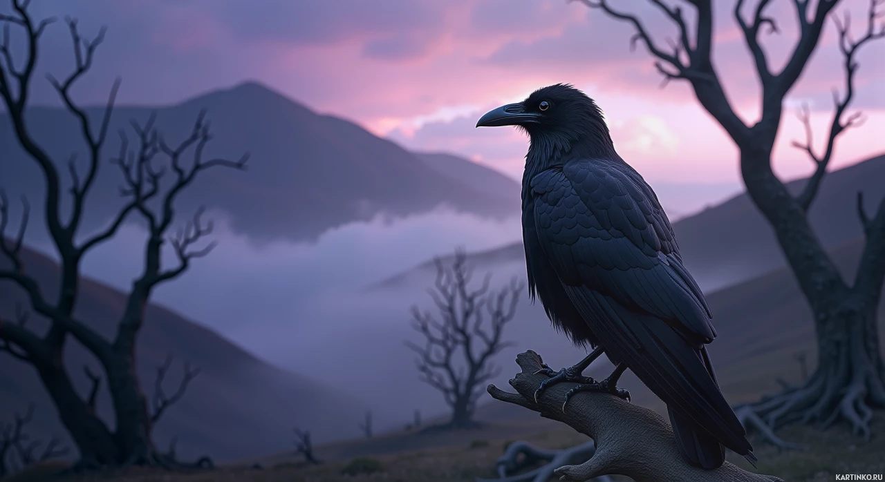Таинственная чёрная птица наблюдает за долиной внизу Картинки с такими же тегами