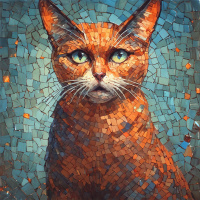 The image depicts a fantasy-style illustration of a tabby cat. The cat has a stylized appearance with detailed fur patterns and striking amber eyes that convey a sense of alertness or focus. Its ears are pointed upwards, and the mouth is slightly open as if it's purring or perhaps even communicating with something unseen. The background is composed of intricate mosaic tile pieces in shades of blue and brown, arranged symmetrically around a central point that draws the viewer's eye towards the cat. The tiles are meticulously placed, creating an ornate backdrop that contrasts with the natural simplicity of the cat's appearance. The overall composition is balanced, with the cat positioned centrally, while the radiating effect of the mosaic tiles extends outward from this central point, enhancing the visual harmony of the image. The lighting and color scheme give the picture an ethereal quality, suggesting a magical or otherworldly setting.