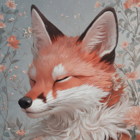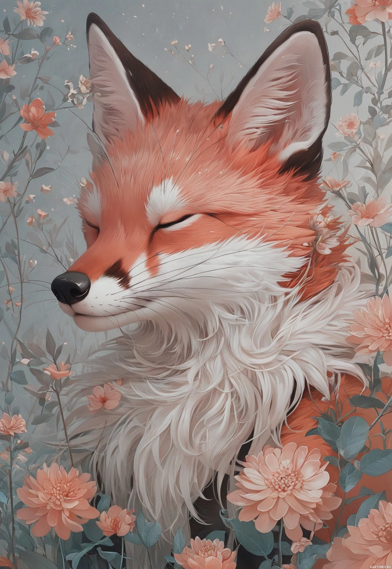 In this image, a fox with closed eyes is depicted. The fox has a white and brown fur pattern, typical of the species. Its head is turned slightly to the left, giving it a contemplative appearance. Behind the fox's head is an array of pink flowers in full bloom, creating a soft backdrop that contrasts with the animal's fur colors. The overall style of the artwork is illustrative and detailed, with realistic shading and textures that bring depth to the image.