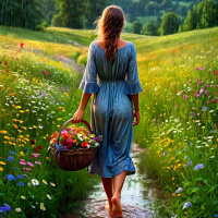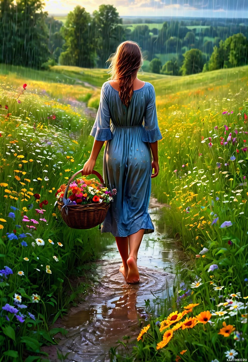 На картинке изображена женщина в длинном платье, стоящая на тропинке во время, кажется, дождя – об этом говорят мокрые земли и капли в воздухе. Она несет корзину, наполненную цветущими цветами, несмотря на погоду. Ее осанка изящна; она отходит от зрителя, создавая ощущение глубины в кадре. Задний план – сельский пейзаж с полями, усыпанными цветами, среди которых ромашки и другие дикие цветы, что добавляет атмосферу спокойствия и красоты, несмотря на погодные условия. Картина передает ощущение мирской безмятежности.