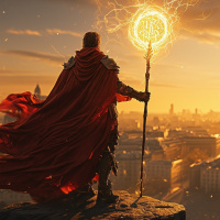 На картинке на переднем плане выделяется персонаж из видеоигры или фэнтезийного произведения. Это мужчина, изображенный со спины, что позволяет увидеть его торс и доспехи, но не лицо. На нём развевается красный плащ, словно под действием сильного ветра или движения. В правой руке он держит посох с горящим символом наверху, который, очевидно, является источником магии или силы в данном контексте. Поза персонажа выражает задумчивость или наблюдение, его взгляд направлен на что-то вне кадра. Задний план – городской пейзаж, освещенный теплыми тонами, характерными для рассвета или заката, и с низко расположенным в небе солнцем. Видны элементы классической архитектуры, такие как купола и арки, что может указывать на историческое значение этого места. Общий стиль картинки – реалистичный, с высокой детализацией, и композиция тщательно продумана для передачи ощущения величия и повествовательности, свойственных жанрам фэнтези или приключений.