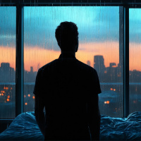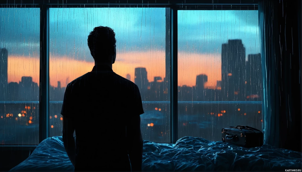 На картинке запечатлён силуэт человека, сидящего на кровати ночью. Снаружи льёт дождь, об этом говорят следы дождя на стеклах и тёмное небо с проблесками света, намекающими на рассвет или закат. В окнах видны огни города, что говорит об урбанистическом окружении. Шторы немного отодвинуты в сторону оконной рамы, которая открыта для проветривания. Поза человека расслаблена, а рядом на кровати стоит чемодан, что может говорить о подготовке к поездке или возвращении из неё.