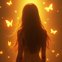 На картинке изображена фигура, стоящая спиной к зрителю. На ней платье, а длинные волосы мягко ниспадают на одно плечо. Вокруг — сказочная сцена с множеством порхающих бабочек, создающих мягкое размытие. Фон темный, контрастирует со светлым, теплым сиянием, исходящим из-за фигуры, как будто она стоит на фоне заката или источника света. Общая композиция передает ощущение спокойствия и единения с природой.