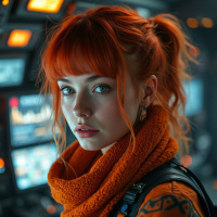 The image depicts a young woman with red hair styled in an updo, wearing a scarf and what appears to be an orange jacket or top. She has a neutral expression on her face and is looking slightly to the side of the camera. Her eyes are a light color and she's wearing some kind of earrings that aren't fully visible due to the angle of the shot. The setting seems to be inside an aircraft cockpit or control room, as indicated by the presence of various gauges, switches, and screens in the background.