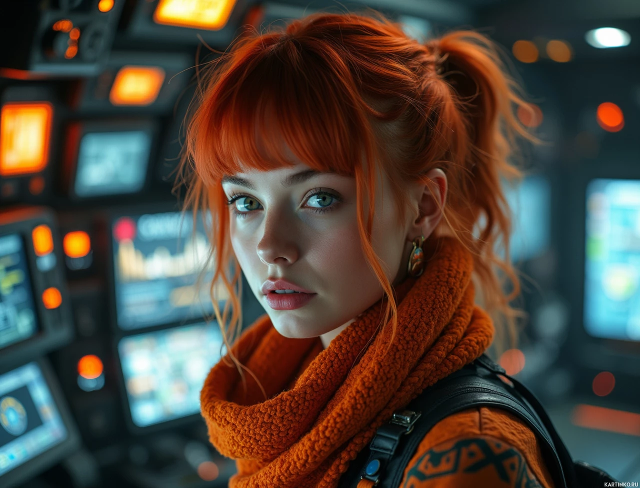 На картинке запечатлена молодая женщина с рыжими волосами, уложенными в пучок, в платке и, похоже, в оранжевой куртке или блузке. У нее спокойное выражение лица, и она смотрит немного в сторону от камеры. Глаза светлые, и на ушах – какие-то серьги, которые из-за ракурса не видны полностью. Судя по различным приборам, переключателям и экранам на заднем плане, действие происходит внутри кабины самолета или диспетчерской.